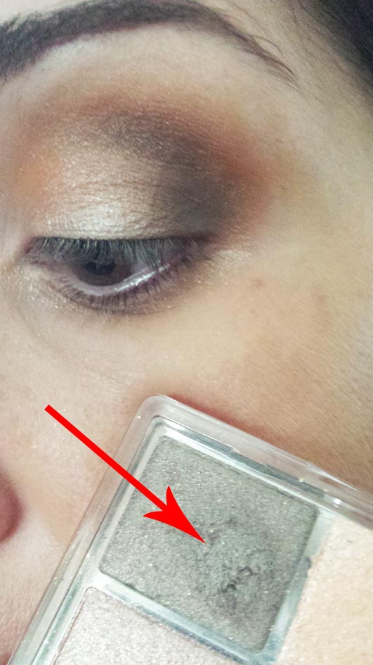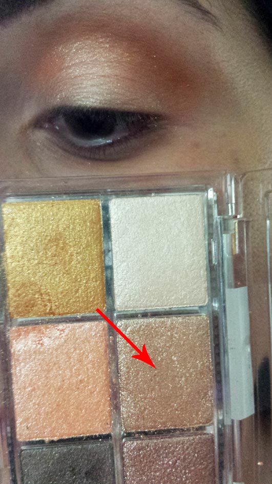 Fase 2: con il polpastrello preleviamo un pochino del marrone della prima fila della palette, la scelta va a seconda della nostra carmagione, se siamo scure prenderemo quello più scuro, se siamo chiare allora opteremo per l'ombretto più chiaro, quello che ho scelto per me. Stendiamolo su tutta la palpebra mobile pressando il colore così da limitare la caduta di brillantini. Come vedete quasi non si vede nella foto, ma vi assicuro che l'effetto è in realtà molto brillante.